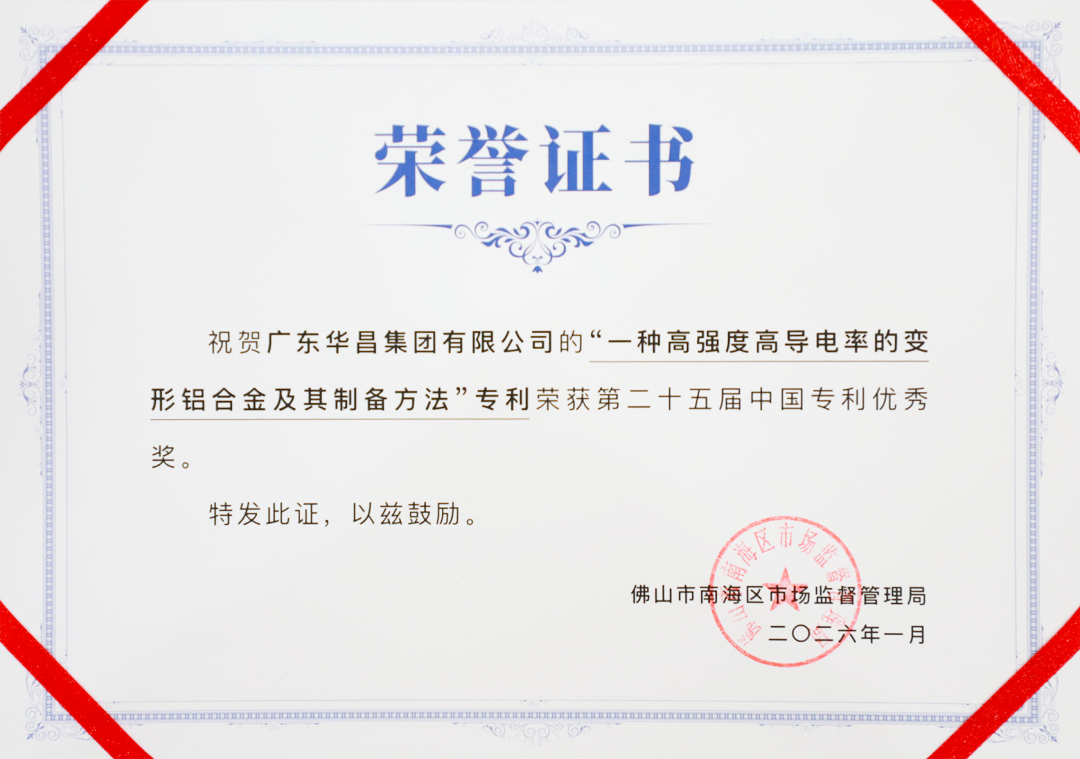 2026年1月22日,佛山市南海区“知识产权引领产业跃升一揽子计划”发布活动隆重举行。活动现场重点展示了区内知识产权工作的标杆成果,并现场为第二十五届中国专利奖获奖企业颁发证书。广东华昌集团有限公司凭借与华南理工大学共创的“一种高强度高导电率的变形铝合金及其制备方法”专利,荣膺中国专利优秀奖,专利产品在佛山市知识产权保护中心作为成果展示之一,华昌集团作为南海区高端材料产业的创新代表,受到现场祝贺与嘉许。这是国家对华昌技术创新实力的最高认可,更是南海区政府对华昌扎根本土、驱动产业升级所作贡献的充分肯定。