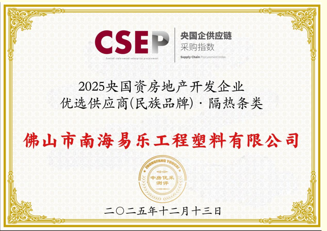 近日,在 “精筑匠心好房 优采新质好材” 供应链合作大会北京站上,白云易乐(佛山市南海易乐工程塑料有限公司)荣耀入选《2025 央国资房地产开发企业优选供应商(民族品牌)研究报告》“隔热条类” 优选供应商!