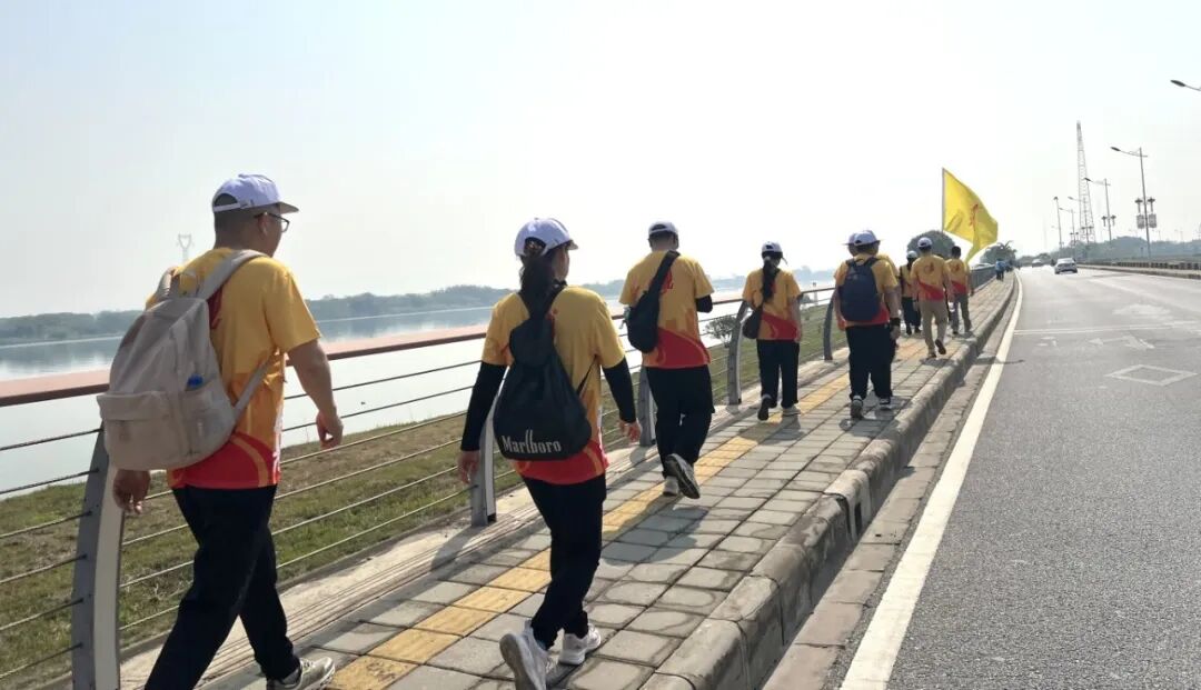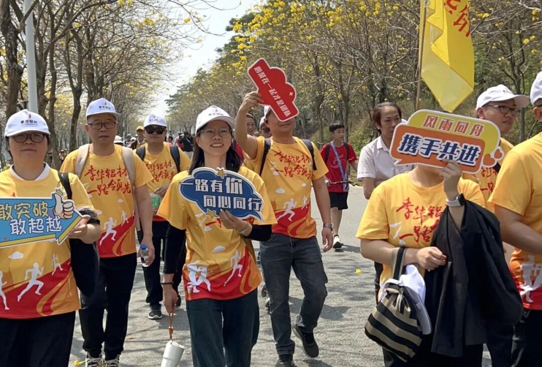 季华铝材的徒步队伍身着定制战袍,高举“季华铝材”旗帜,成为沿途一道亮丽风景线!从高明苏村到世纪莲体育中心,50公里征程中,季华团队互相扶持、挑战极限,用行动诠释“铝业匠心,坚韧同行”的企业精神!