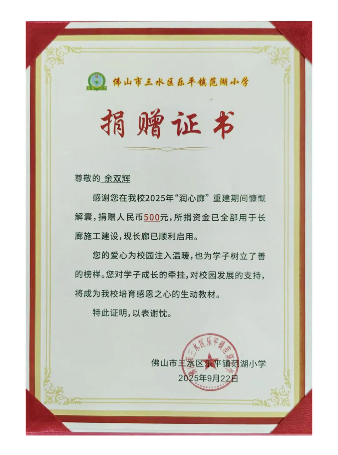佛山市英辉铝型材有限公司作为佛山市三水区铝加工行业协会常务副会长单位,积极响应协会号召,为乐平镇范湖小学捐赠两万元。公司总经理余双辉捐赠500元。公司同事黄泽健捐赠100元、韦统文捐赠100元。公司荣获乐平镇范湖小学颁发的“爱心企业”荣誉牌匾。