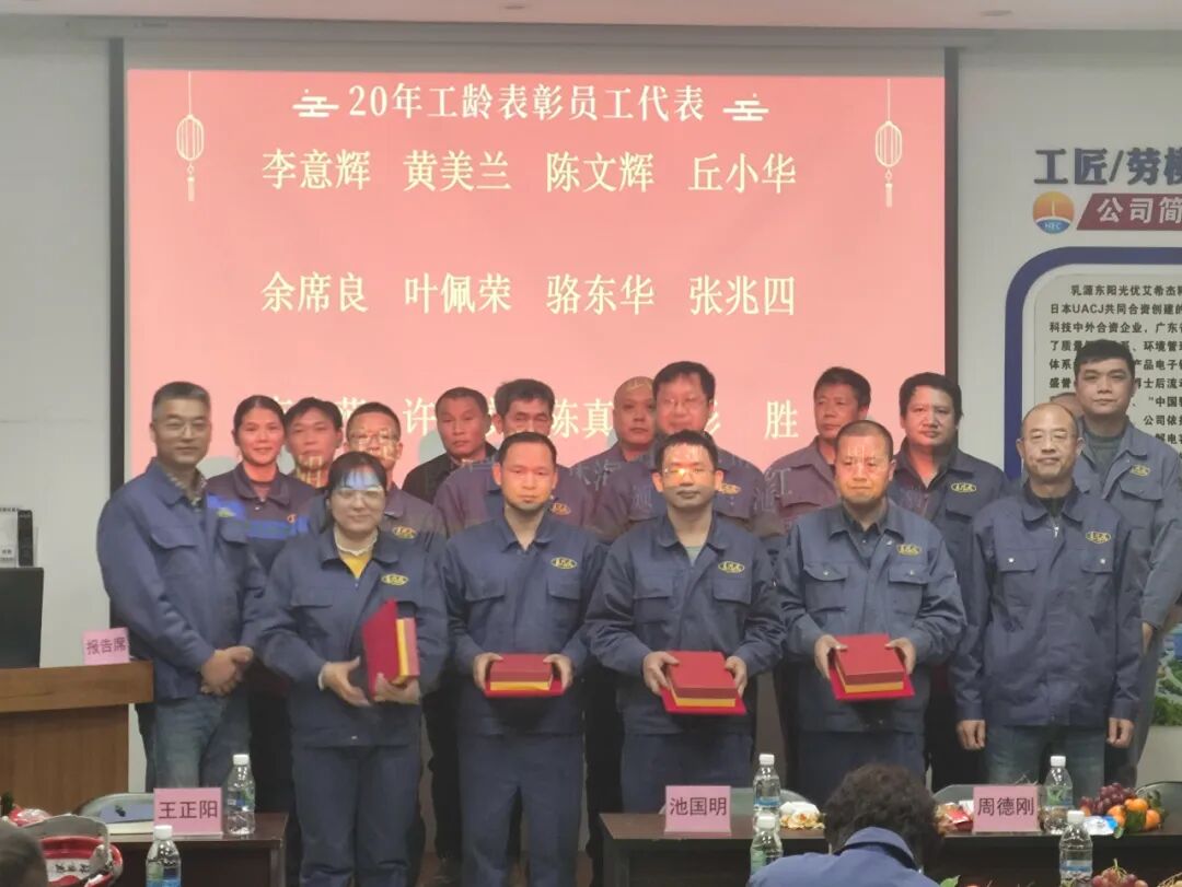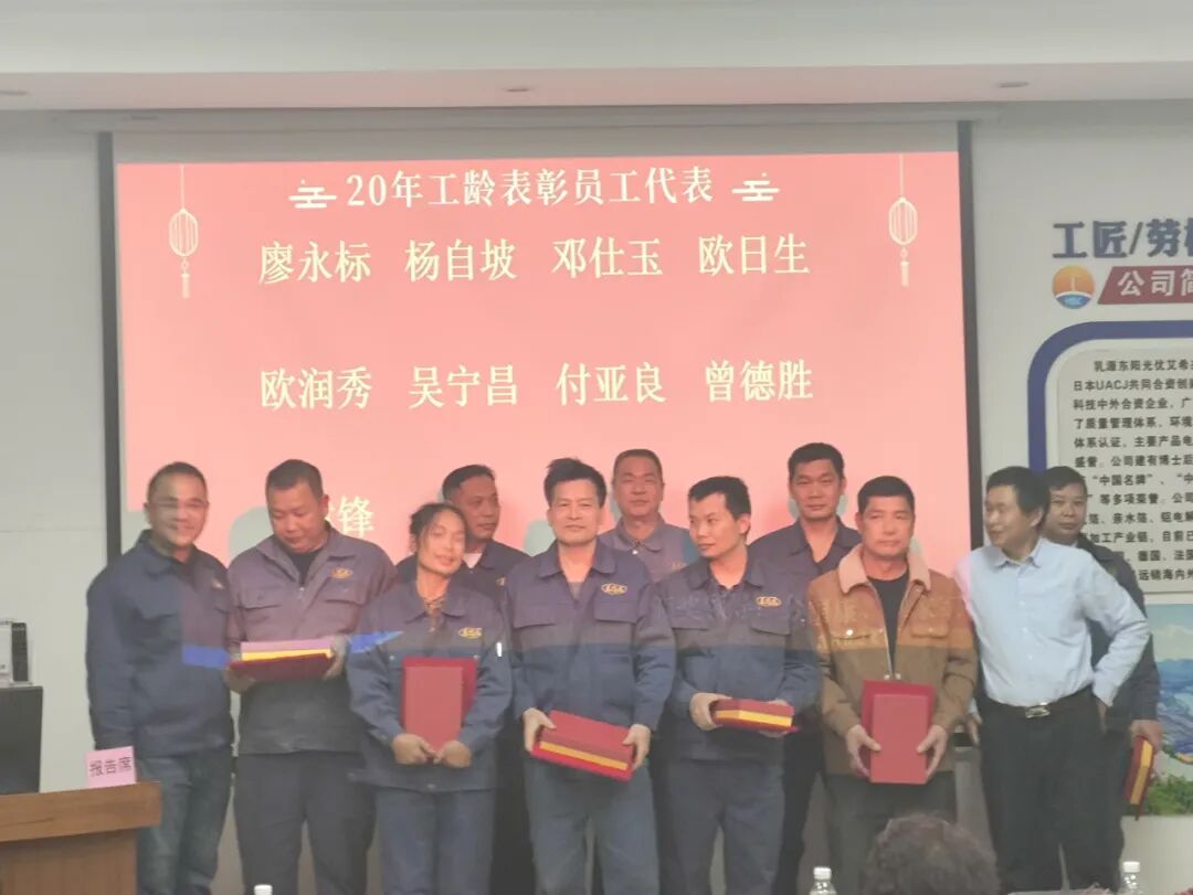 感恩有你 风雨兼程 企业: #乳源东阳光优艾希杰精箔有限公司 发布时间: 2025-01-16 点击量: 497 来源: 乳源东阳光优艾希杰精箔有限公司 分享: ——精箔公司召开“20周年功勋员工”表彰座谈会公司的发展离不开每一位员工的辛勤付出,在我们的团队中,有一批员工已经在公司兢兢业业工作了20年。他们用自己的青春和汗水,见证并参与了公司从起步到成长壮大的光辉历程。为了表达对这些资深员工的敬意与感激,同时也为了传承他们的敬业精神,1月15日下午,乳源东阳光优艾希杰精箔有限公司召开了“20周年功勋员工”表彰座谈会。公司常务副总王正阳、副总经理池国明等厂领导和在公司工作满20周年工龄表彰员工等70余人出席了本次座谈会。 会上,公司副总经理池国明回顾了公司二十年以来的发展历程,精箔公司成立于2002年6月,2010年1月引进日资, 成立中日合资企业,精箔公司现有一、二、三期三个工厂,员工1000余人。公司先后获评为“国家高新技术企业”、荣获“中国名牌”、“中国驰名商标”、“国家绿色工厂 ”、“国家知识产权优势企业”、“广东省政府质量奖”、“广东省高新技术企业”、“广东五星品牌”等众多重要荣誉,成为国内规模较大、技术领先的铝板带箔生产企业,在国内外同行享有崇高声誉。2024年,精箔公司实现产值近38亿,生产效益创历史最好水平。这些辉煌成就的取得,离不开大家的共同努力、相互扶持、彼此成就。随后,老员工们纷纷踊跃发言,分享着自己这20年来的难忘经历。这些故事不仅仅是个人的回忆,更是公司发展史上一个个生动的注脚。他们感慨于公司提供的发展平台,让自己能够在职业生涯中不断成长,实现自我价值,同时也表达了对公司未来发展的坚定信心和美好期盼。公司常务副总王正阳在总结中表示,二十年来,大家来自五湖四海、各行各业,精英汇聚。二十年间,大家齐心协力,日夜生产,推动公司不断发展,企业规模持续扩大。大家是公司最忠诚的力量,在生产、技术、管理等岗位各方面均可独当一面,企业持续发展离不开老员工对新员工的带动以及经验传承,充分诠释了”忠诚·规矩·规划·创新“的东阳光人品格。增长的是年龄,丰富的是阅历和经验,过去的日子,我们取得了辉煌的成绩,希望大家再接再厉、积极进取、接续奋斗、再创辉煌!最后,公司领导为入职20周年的员工颁发了专属纪念品,诚挚感谢他们二十年如一日的无私奉献。一份份沉甸甸的纪念品既是对大家过去奋斗岁月的充分肯定,也寄托着对大家砥砺前行、再立新功的殷切期许。乳源东阳光优艾希杰精箔有限公司2025-01-15