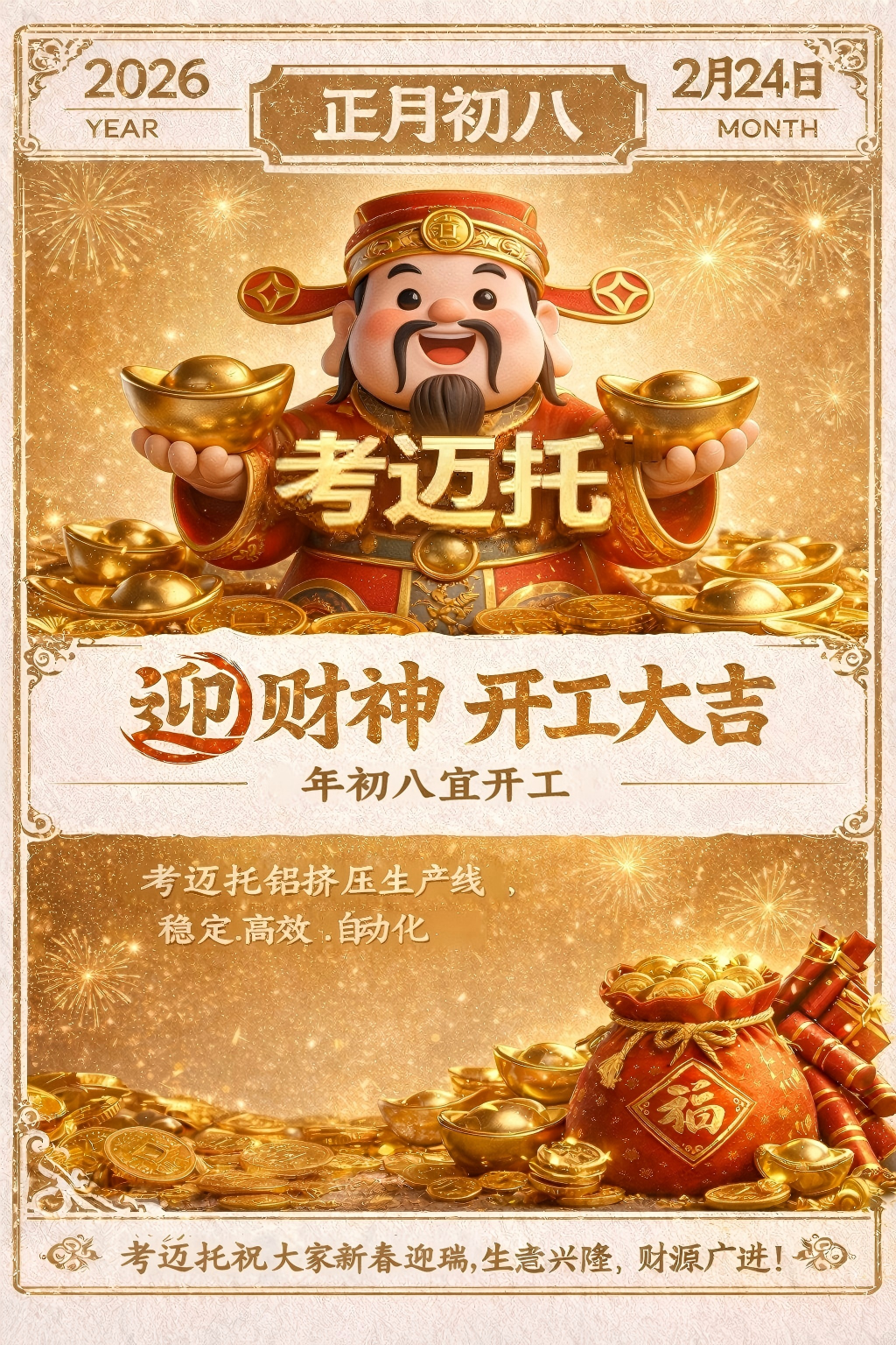 正月初八 · 开工大吉 企业: #考迈托 发布时间: 2026-02-24 点击量: 46 来源: 考迈托 分享: 正月初八,启市纳财!?假期归零,奋斗重启。新的一年,考迈托将继续坚守匠心,深耕品质。以专业实力赋能项目,以优质服务回馈信赖。2026,我们全力以赴,共赴锦绣前程!?