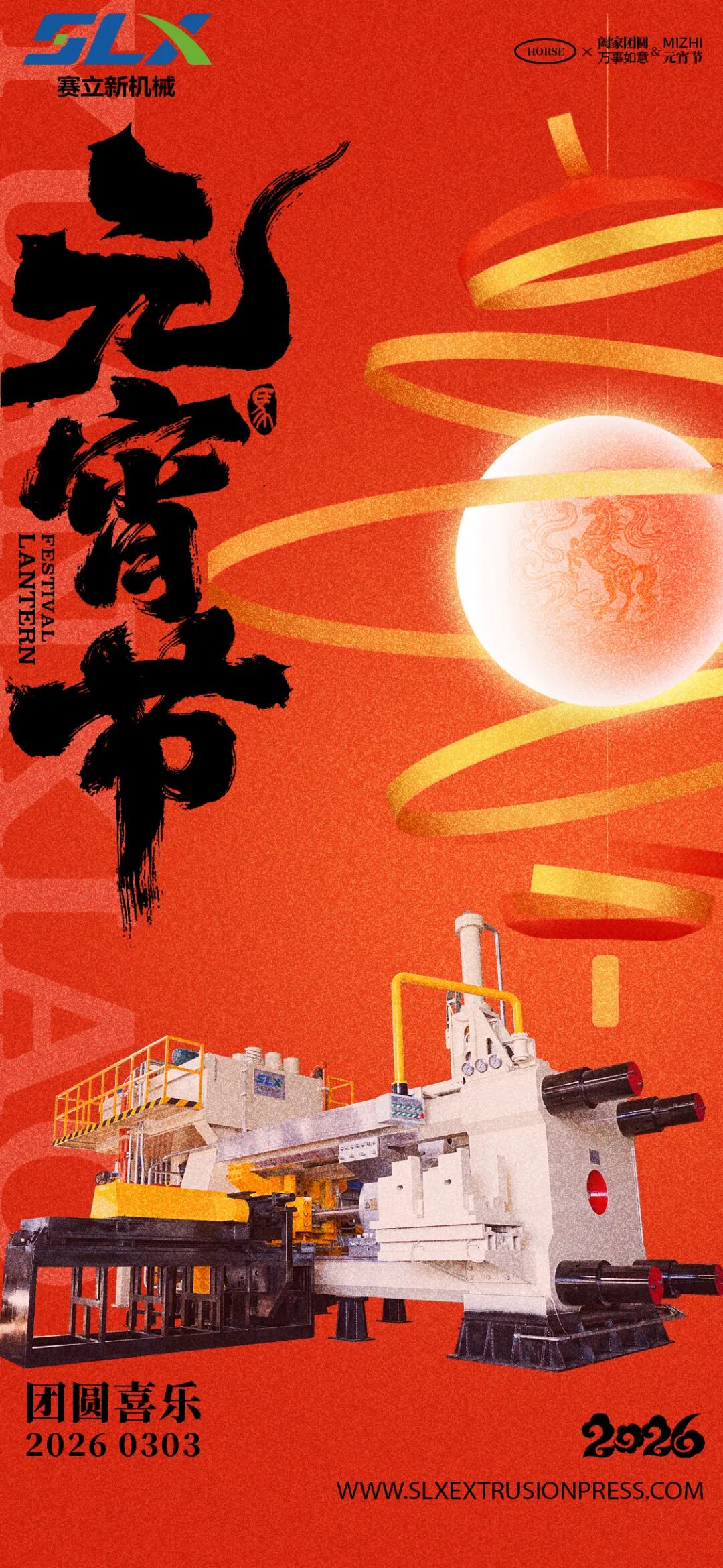 元宵喜乐 · 团圆同行|赛立新机械祝您2026年万事顺遂! 企业: #SLX赛立新机械 发布时间: 2026-03-04 点击量: 6 来源: SLX赛立新机械 分享: 灯火阑珊映团圆,机械铿锵助远行。值此2026年元宵佳节之际,赛立新机械(SLX)全体同仁向您致以最诚挚的节日问候与美好祝福!? 今宵月圆人更圆,愿您与家人围坐灯前,共品汤圆香甜,共享天伦之乐;⚙️ 来年事业更辉煌,愿我们的挤出机设备助您生产顺畅、效率倍增,在智能制造的赛道上稳步前行!2026,是奋进之年,也是团圆之年。赛立新机械将继续秉持“匠心制造,服务全球”的理念,为您提供高效、稳定、智能的挤出解决方案,与您携手共筑美好未来!? 元宵节快乐,阖家幸福安康!? 2026年3月3日,我们与您同心同行,共启新程!? 了解更多产品与服务,欢迎访问官网:WWW.SLXEXTRUSIONPRESS.COM