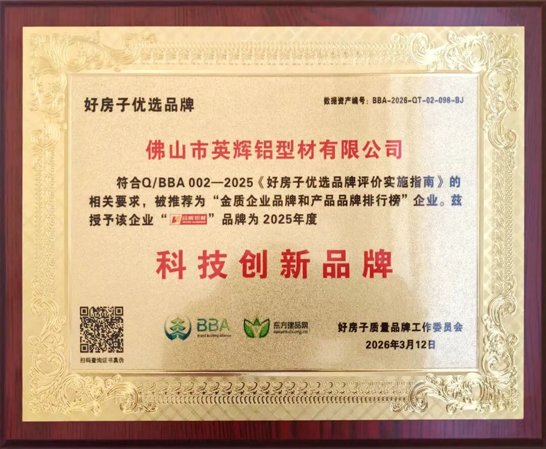 大会还举行了表彰环节,为在科技创新领域表现突出的十家企业颁发了“好房子优选品牌·科技创新品牌”称号。经过严格的专业评审与综合考量,英辉铝业凭借其在科技创新领域的持续投入、突破性成果以及对行业发展的积极贡献,从众多参评企业中脱颖而出,被大会授予“科技创新品牌”荣誉称号,并获颁荣誉牌匾。这一殊荣不仅是对英辉铝业过往创新努力的高度肯定,更是对其未来继续引领行业技术变革的深切期许。