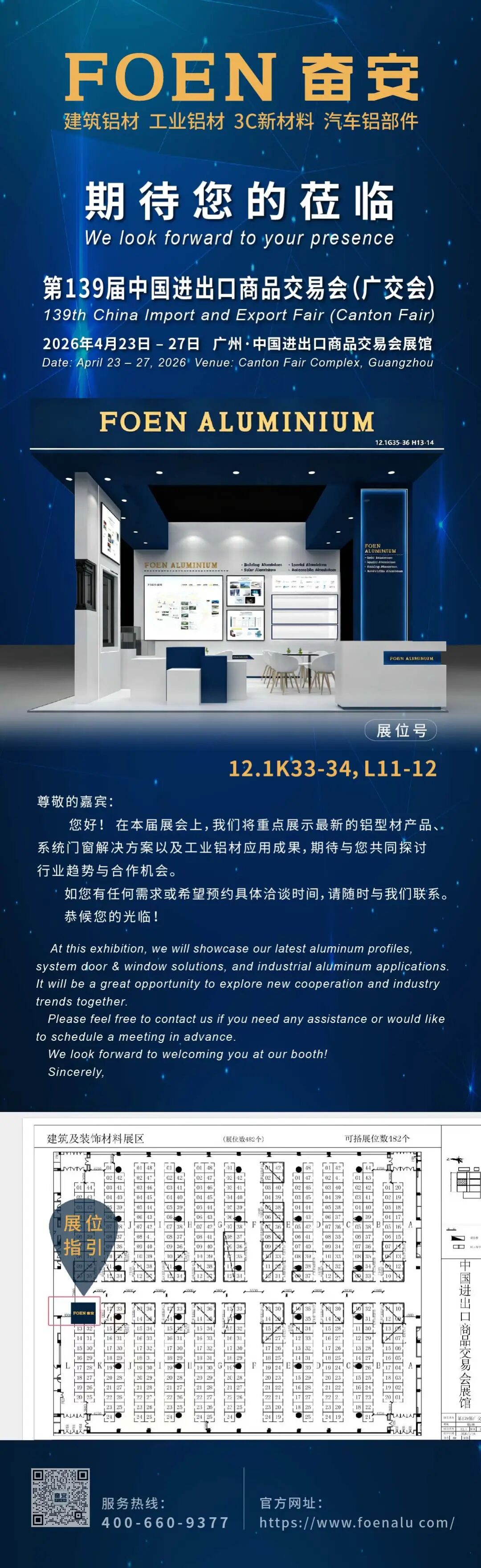 在铝型材行业加速向高端化、轻量化、智能化迈进的背景下,第139届中国进出口商品交易会(广交会)将于4月23日在广州盛大启幕。此次盛会,汇聚了全球客商与先进制造领域的标杆企业,共同探索产业升级与贸易合作的新机遇。作为中国铝型材行业的领军企业,奋安铝业将携多款新品出席参加,全面展现“智慧工厂”的数字化智造实力。诚邀海内外新老朋友莅临奋安铝业展位,共襄盛举,擘画未来!