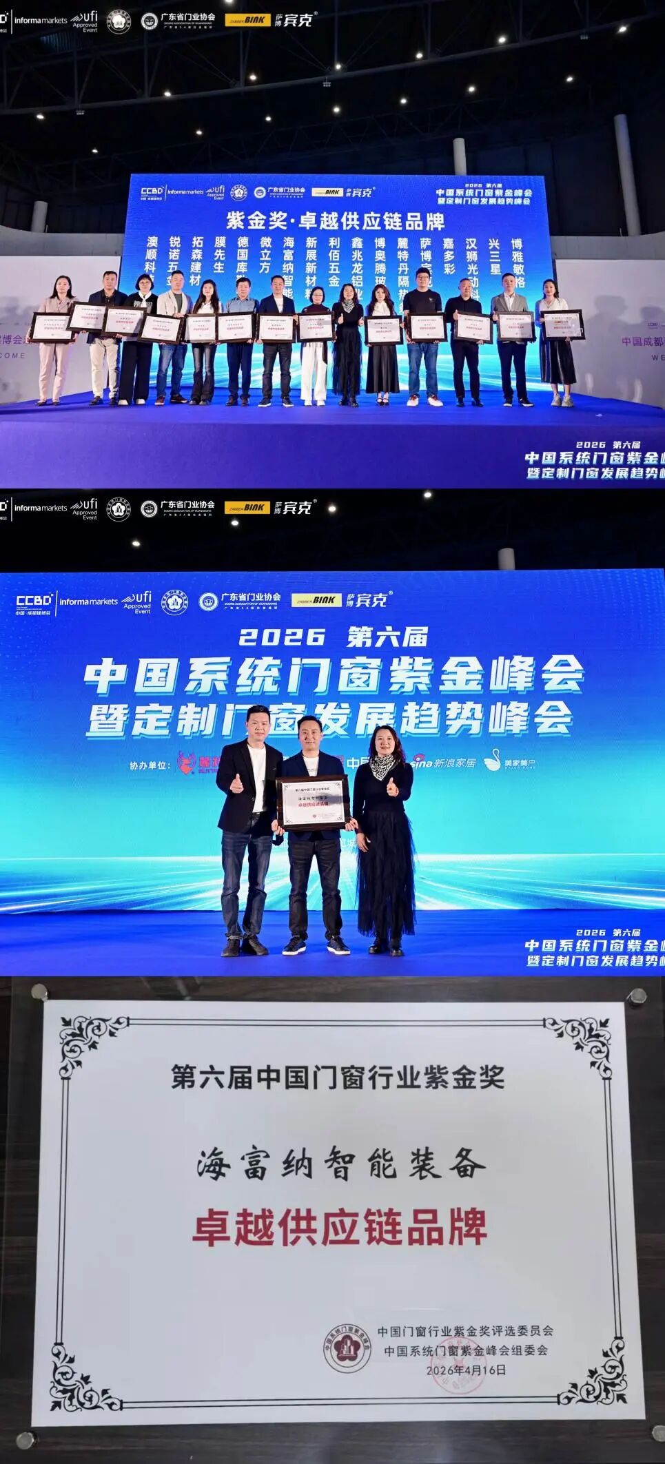 峰会压轴的“紫金奖”颁奖典礼备受瞩目,旨在表彰坚守品质、勇于革新的行业标杆企业。凭借硬核技术实力、稳定供应链服务及深厚行业积淀,海富纳智能装备荣膺第六届门窗行业紫金奖“卓越供应链品牌”荣誉,获行业高度认可。